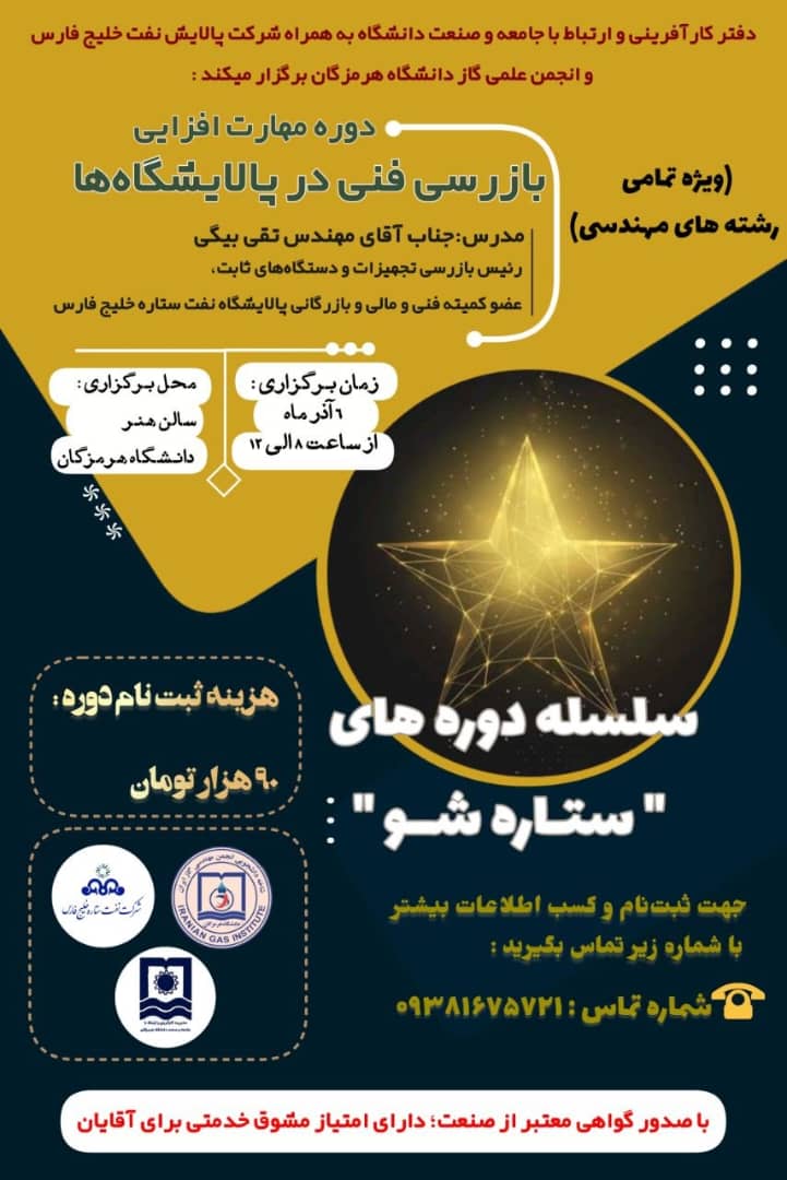 مدیریت کارآفرینی و ارتباط با جامعه دانشگاه هرمزگان با همکاری شرکا پالایش نفت خلیج فارس و انجمن علمی گاز دانشگاه برگزار می­کند.