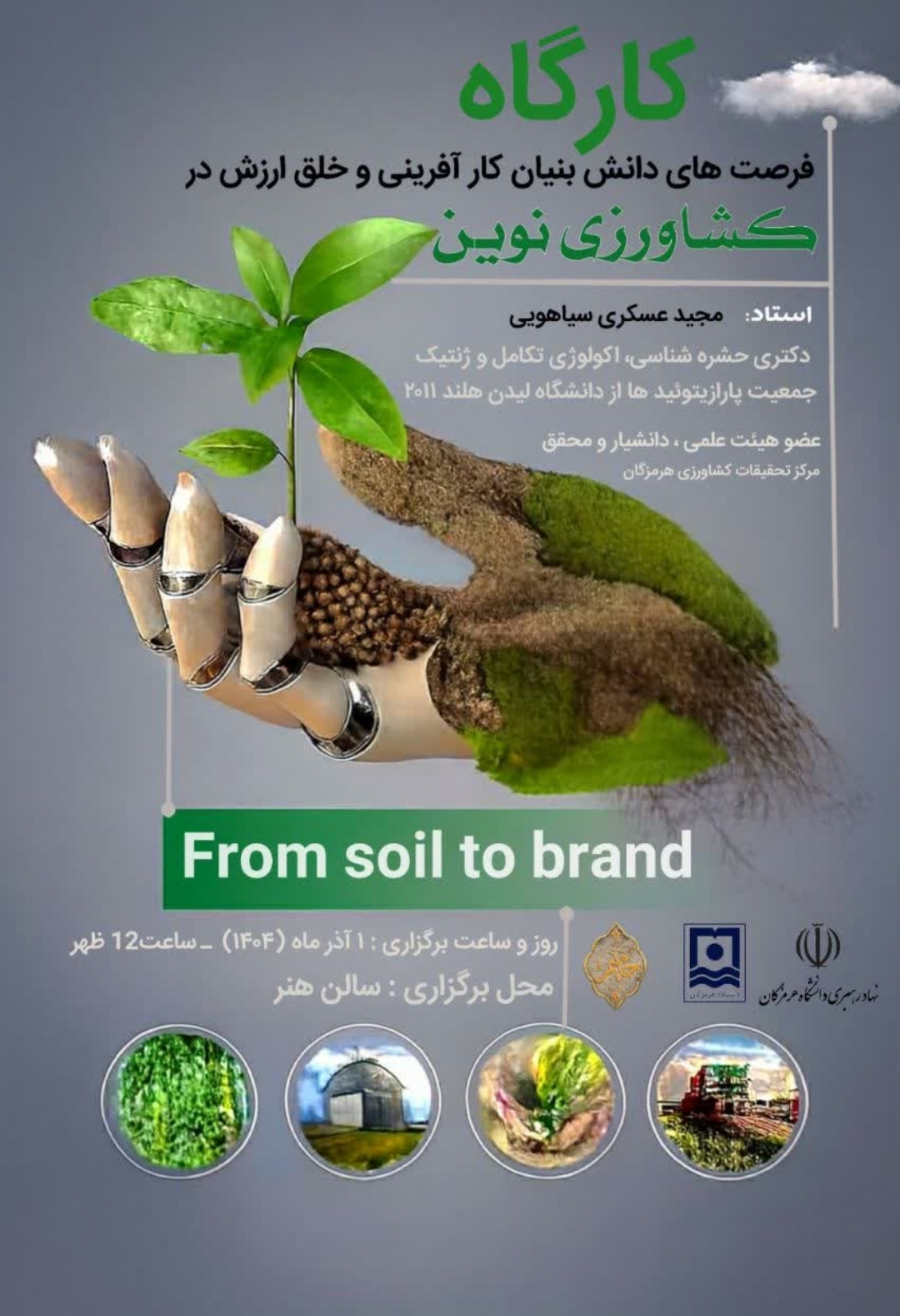 کارگاه تخصصی با عنوان فرصت های دانش بنیان کارآفرینی و خلق ارزش در کشاورزی نوین توسط جناب آقای دکتر مجید عسکری سیاهویی عضو هیات علمی، دانشیار و محقق مرکز تحقیقات کشاورزی هرمزگان در تاریخ 1404/09/01 با همکاری نهاد رهبری دانشگاه هرمزگان در مکان سالن هنر دانشگاه هرمزگان برگزار گردید.